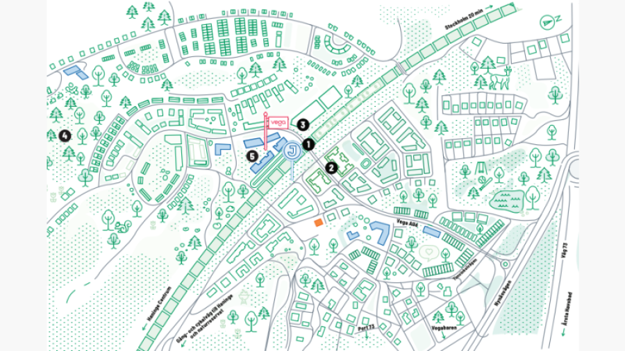 För dig som kommer med bil så har Vega fått en egen avfart från riksväg 73 vilket gör bilresan smidigare då du slipper trafiken vid Haningeavfarten.
